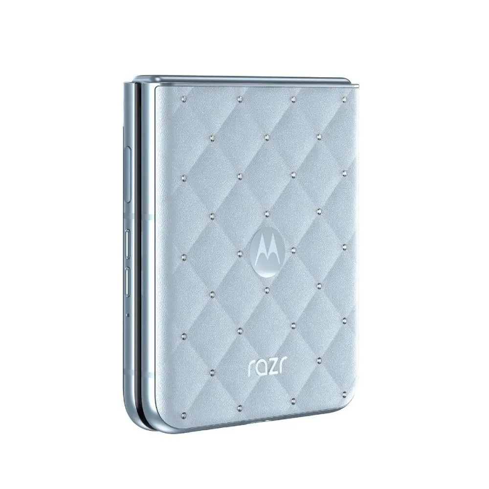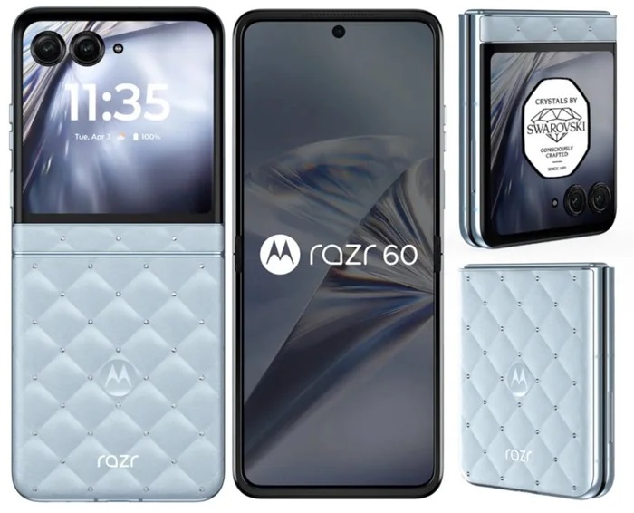 The Motorola Razr 60 Swarovski Edition is a luxury, fashion-focused foldable, featuring 35 hand-set Swarovski crystals on a PANTONE Ice Melt finish, plus a 26-facet crystal-studded hinge. It includes a 6.9″ 120Hz pOLED screen, a 3.6″ outer display, a MediaTek Dimensity 7400X processor, 8GB RAM, and a 50MP camera system, offering a blend of high-tech functionality and premium design.